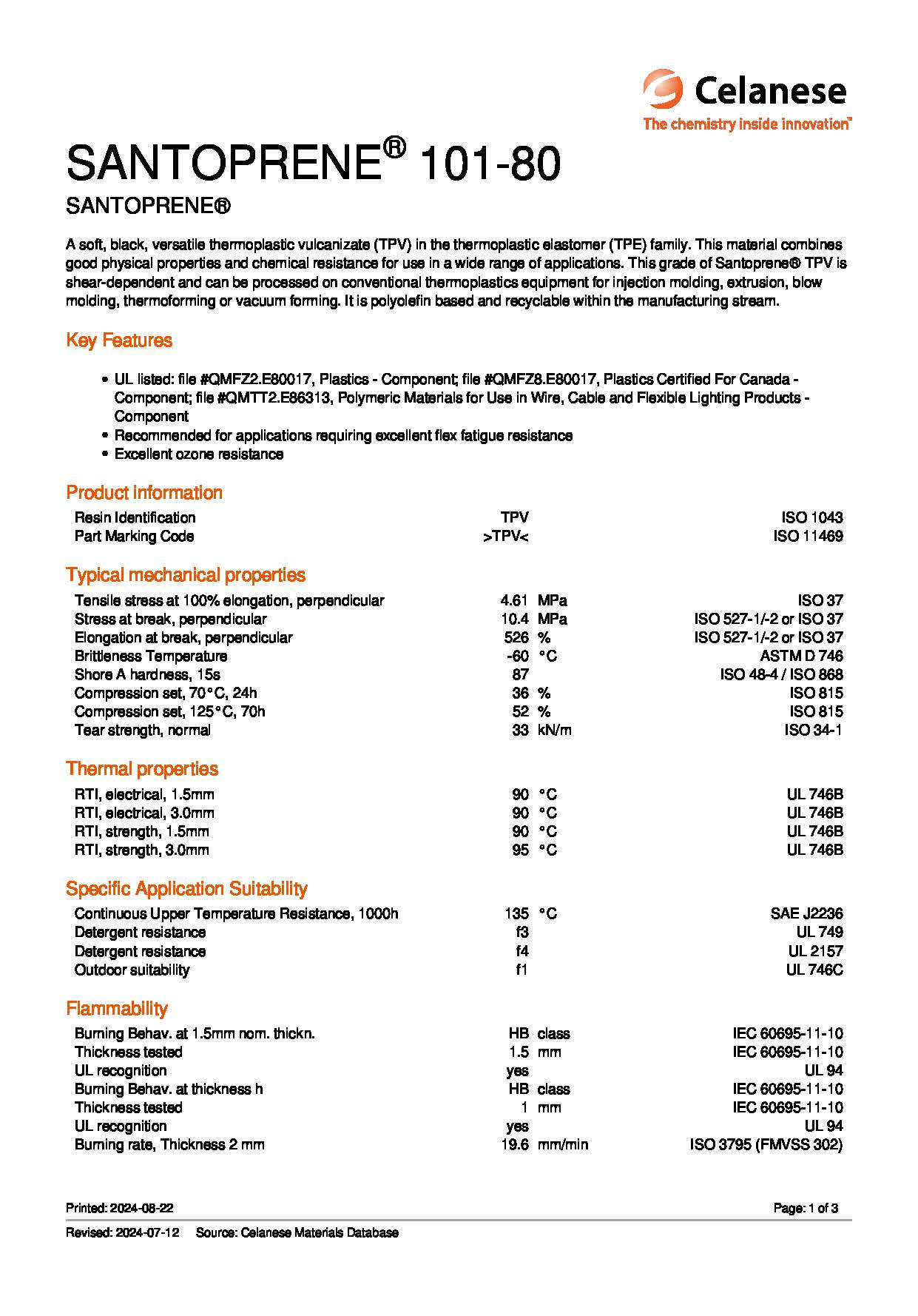 A soft, black, versatile thermoplastic vulcanizate (TPV) in the thermoplastic elastomer (TPE) family. This material combines good physical properties and chemical resistance for use in a wide range of applications. This grade of Santoprene? TPV is shear-dependent and can be processed on conventional thermoplastics equipment for injection molding, extrusion, blow molding, thermoforming or vacuum forming. It is polyolefin based and recyclable within the manufacturing stream.Key Features UL listed: file #QMFZ2.E80017, Plastics - Component; file #QMFZ8.E80017, Plastics Certified For Canada - Component; file #QMTT2.E86313, Polymeric Materials for Use in Wire, Cable and Flexible Lighting Products - Component Recommended for applications requiring excellent flex fatigue resistance Excellent ozone resistance