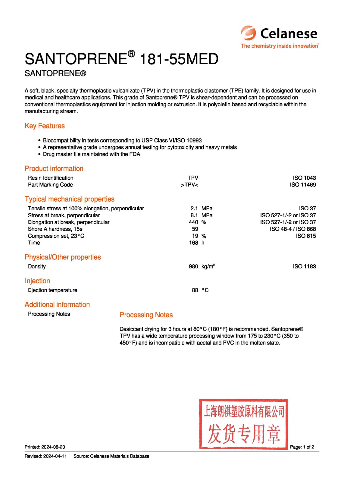 A soft, black, specialty thermoplastic vulcanizate (TPV) in the thermoplastic elastomer (TPE) family. It is designed for use in medical and healthcare applications. This grade of Santoprene? TPV is shear-dependent and can be processed on conventional thermoplastics equipment for injection molding or extrusion. It is polyolefin based and recyclable within the manufacturing stream.Key Features Biocompatibility in tests corresponding to USP Class VI/ISO 10993 A representative grade undergoes annual testing for cytotoxicity and heavy metals Drug master file maintained with the FDA