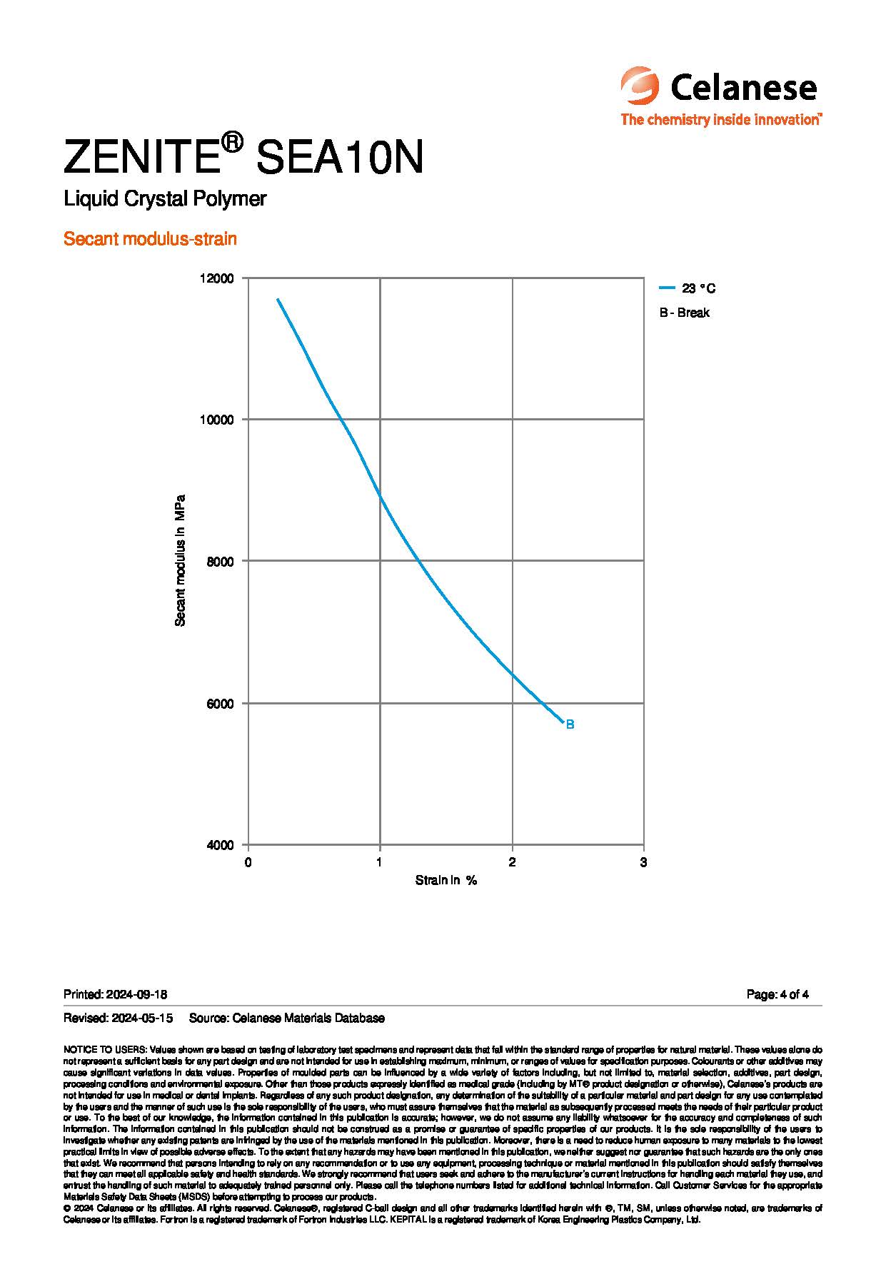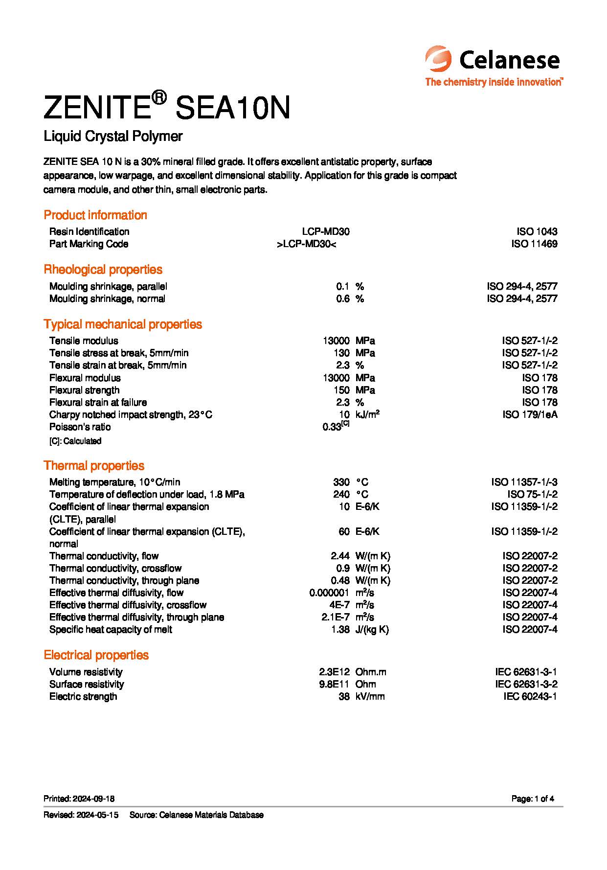 ZENITE SEA 10 N is a 30% mineral filled grade. It offers excellent antistatic property, surface appearance, low warpage, and excellent dimensional stability. Application for this grade is compact camera module, and other thin, small electronic parts.